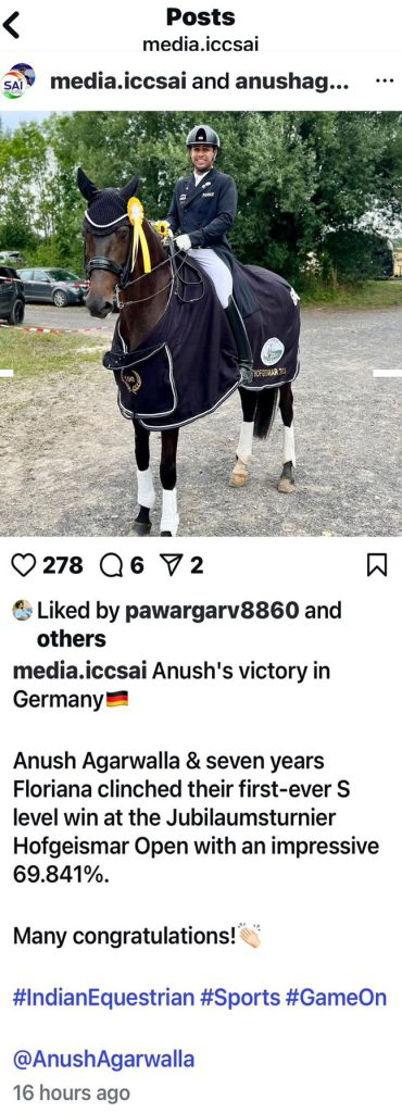Anush Agarwalla winning first ever S level Dressage in Germany November 27, 2025 admin No Comment 38 Views Share on Anush Agarwalla winning first ever S level Dressage in Germany
