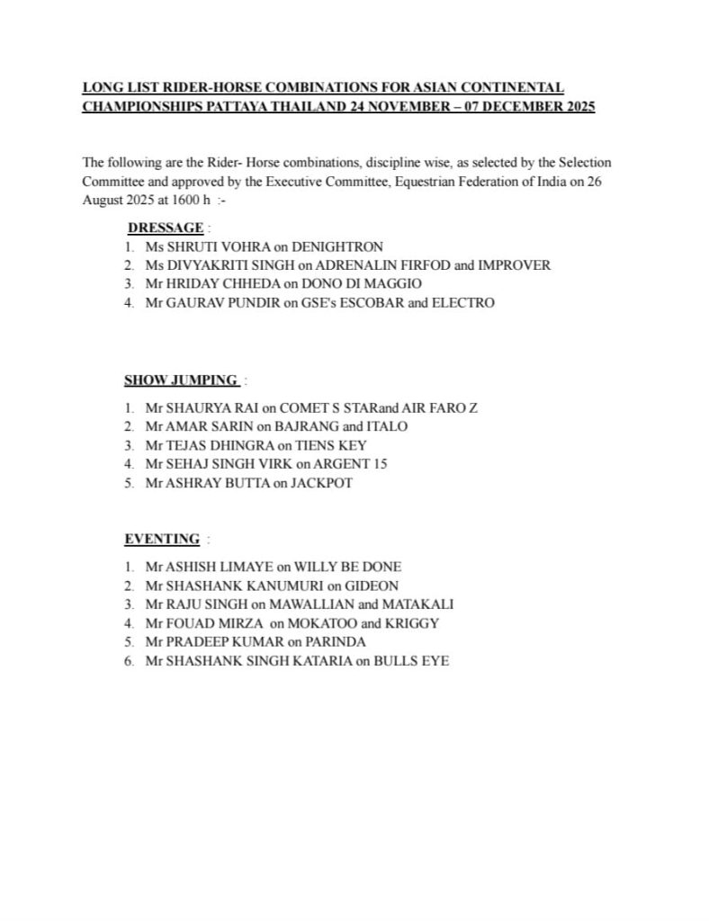 Long list rider-horse combinations for continental championships Pattaya Thailand 24 November-07 December 2025 November 27, 2025 admin No Comment 51 Views Share on Long list rider-horse combinations for continental championships Pattaya Thailand 24 November-07 December 2025