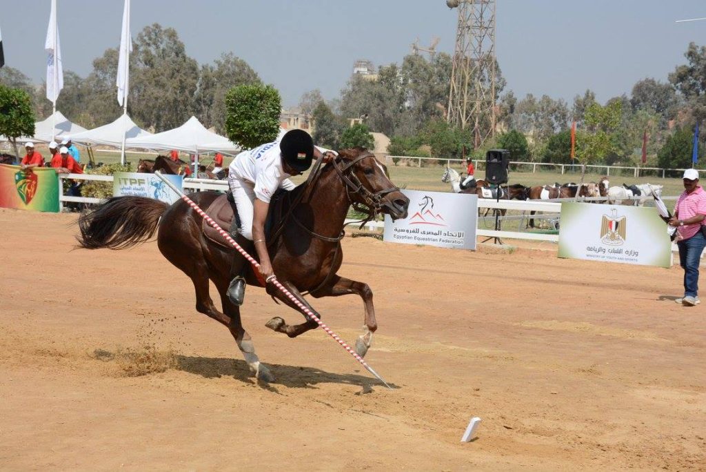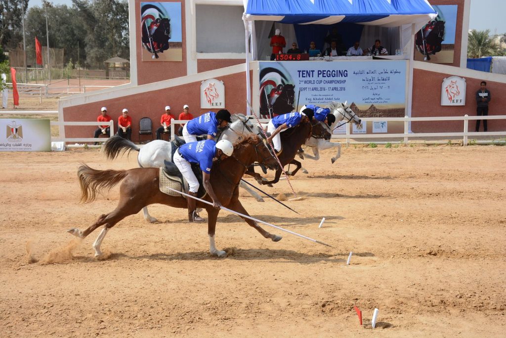 Tent pegging involves horse and rider racing along a 100 meter course and collecting, cutting, shooting, or accurately “stabbing” a series of pegs, lemons, rings, or mannequins along the way. The targets used for tent pegging has several variations, like, a ring – a rider’s weapon should successfully pass through the ring without making contact, a lemon – where, a rider is required to stab or slice a suspended lemon, a mannequin – where a rider should attack at a certain fixed part of the target. Tent pegging competitions vary based on a few factors like, the size and shape of targets, number of consecutive targets, types of weapons allowed, the duration in which the course has to be completed, and the manner in which the target has to be attacked.